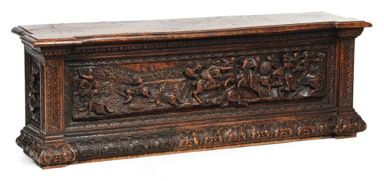 CASSONE ou petit coffre en chêne mouluré sculpté à décor en bas-relief sur trois panneaux, le panneau principal d'une armée en déroute submergée par les flots, les panneaux latéraux de cavaliers en proie aux eaux. Probablement une représentation de la déroute de Pharaon dans la Mer Rouge. Montants sculptés.