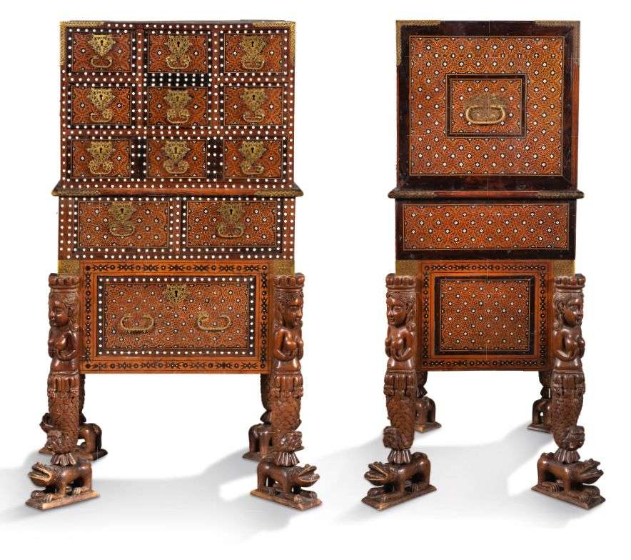 CABINET CONTADOR en bois exotique sculpté et marqueterie d'ébène et os ouvrant à six tiroirs en partie haute et trois tiroirs en partie basse, les poignées en laiton, le piètement antropomorphe figurant des sirènes en espagnolettes reposant sur des chimères.