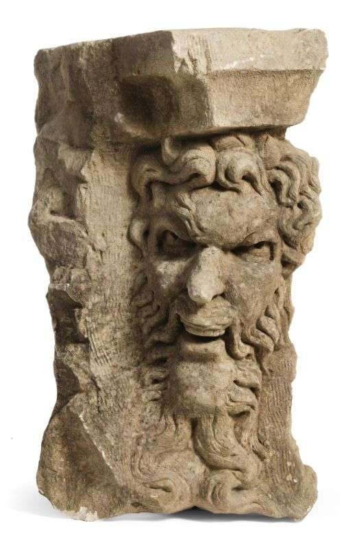 FRAGMENT D'ENTABLEMENT en pierre sculptée d'un homme barbu en colère.