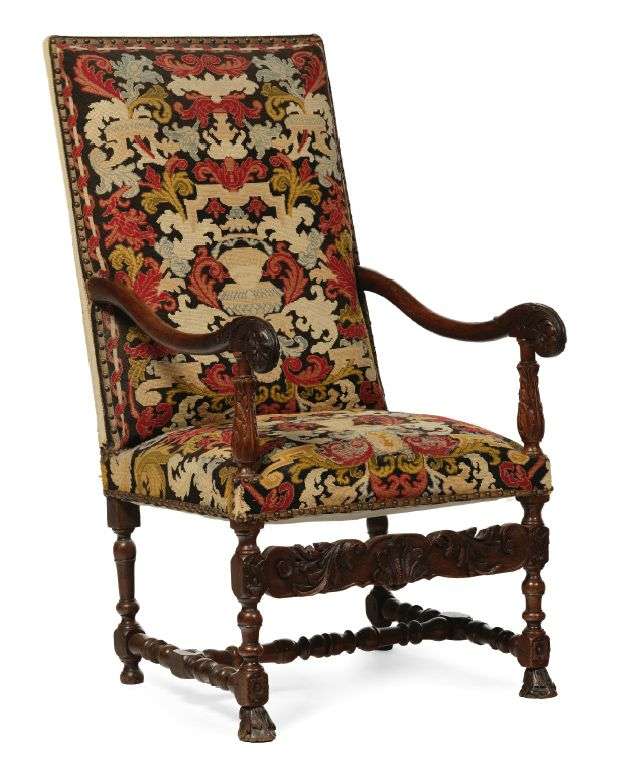 FAUTEUIL A HAUT DOSSIER en chêne finement sculpté, les bras terminés par un enroulement en feuille d'acanthe et grandes fleurs de narcisse. Consoles d'accotoirs en balustres à feuilles d'acanthe.