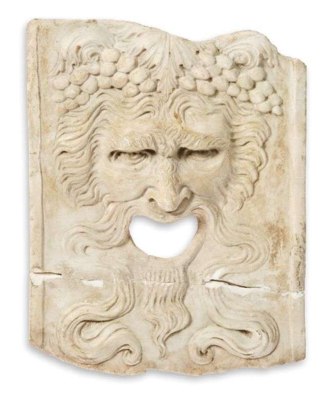 MASQUE DE FONTAINE en marbre blanc sculpté en bas relief d'un faune grimaç