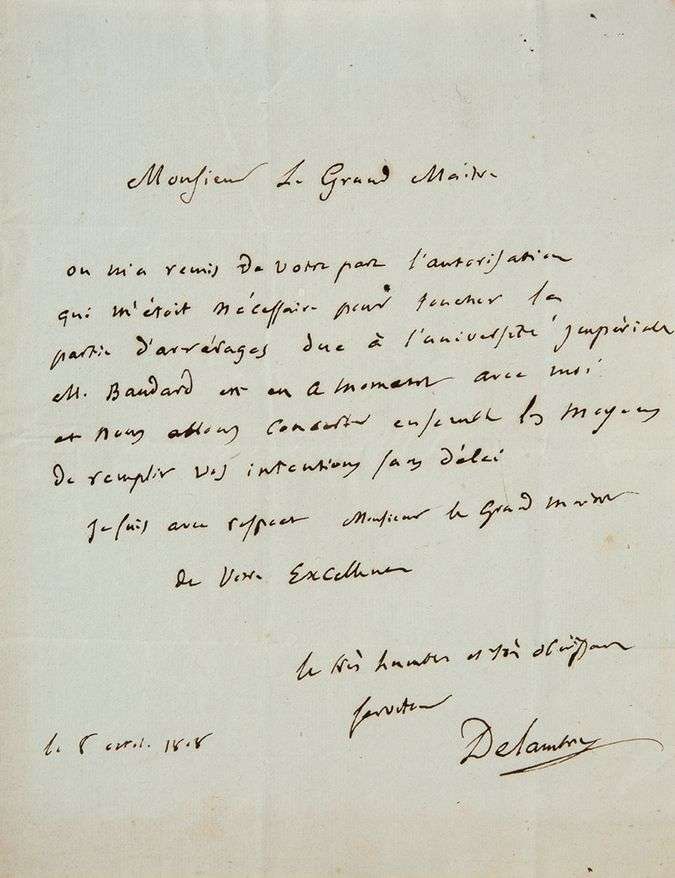 DELAMBRE Jean-Baptiste-Joseph (1749-1822) astronome. L.A.S. « Delambre », 8 avril 1808, à Louis de FONTANES, Grand Maître de l'Université impériale | 1 page in-4, adresse.