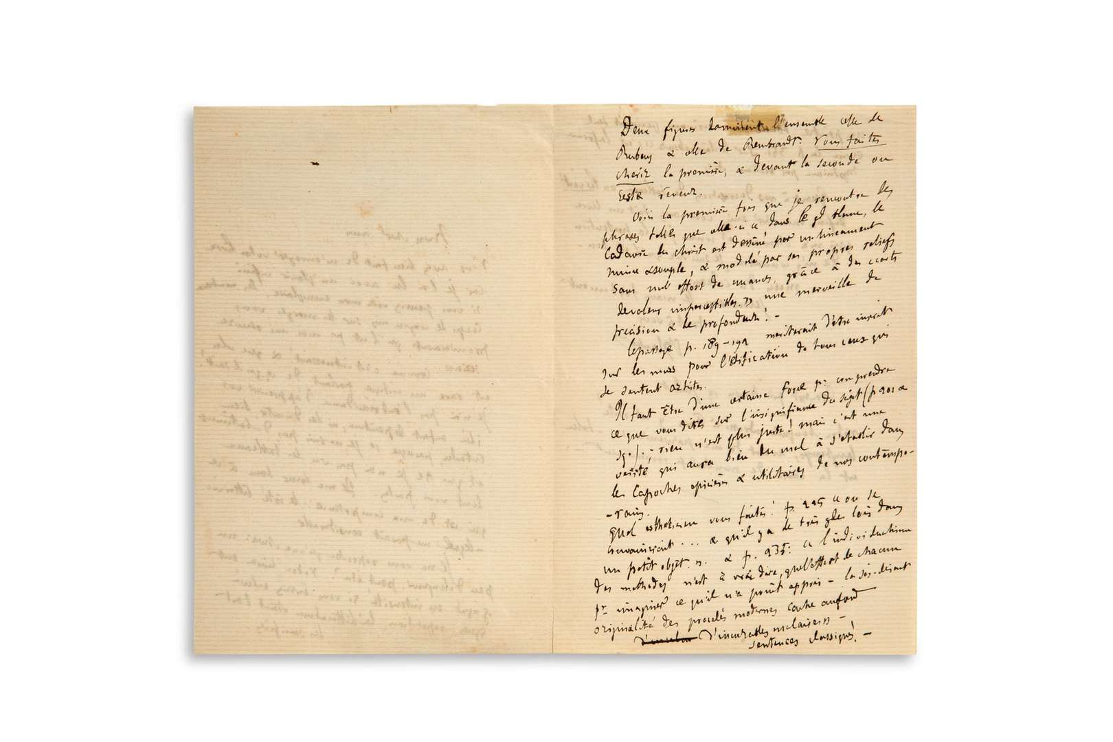 Les Maîtres d'autrefois, Belgique, Hollande, venait de paraître chez Plon | il fut aussitôt reconnu comme l'un des grands livres de critique d'art. Ecrivain et peintre lui-même, ami de Delacroix, Eugène Fromentin (1820-1876) y analyse notamment les oeuvres de Rubens et de Rembrandt. Il avait adressé un exemplaire à Flaubert. Dans sa réponse, ce denier loue les qualités descriptives du livre - " une merveille de précision et de profondeur ", évoquant les sujets qui lui tiennent à coeur, comme l'insignifiance du sujet, qui sera le credo du mouvement naturaliste, contre " les caboches épicières et utilitaires de nos contemporains " Fromentin mourra subitement quelques mois plus tard.