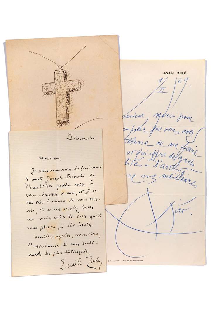 Joan MIRO (1 pièce), Paul VALERY (4 pièces et 3 photographies), Sacha GUITRY (1 pièce), Eugene SUE (1 pièce), Pierre LOUYS (4 pièces), Max JACOB (1 pièce), Emile ZOLA (1 pièce), George SAND (1 pièce) et Charles NICOLLE (1 pièce).