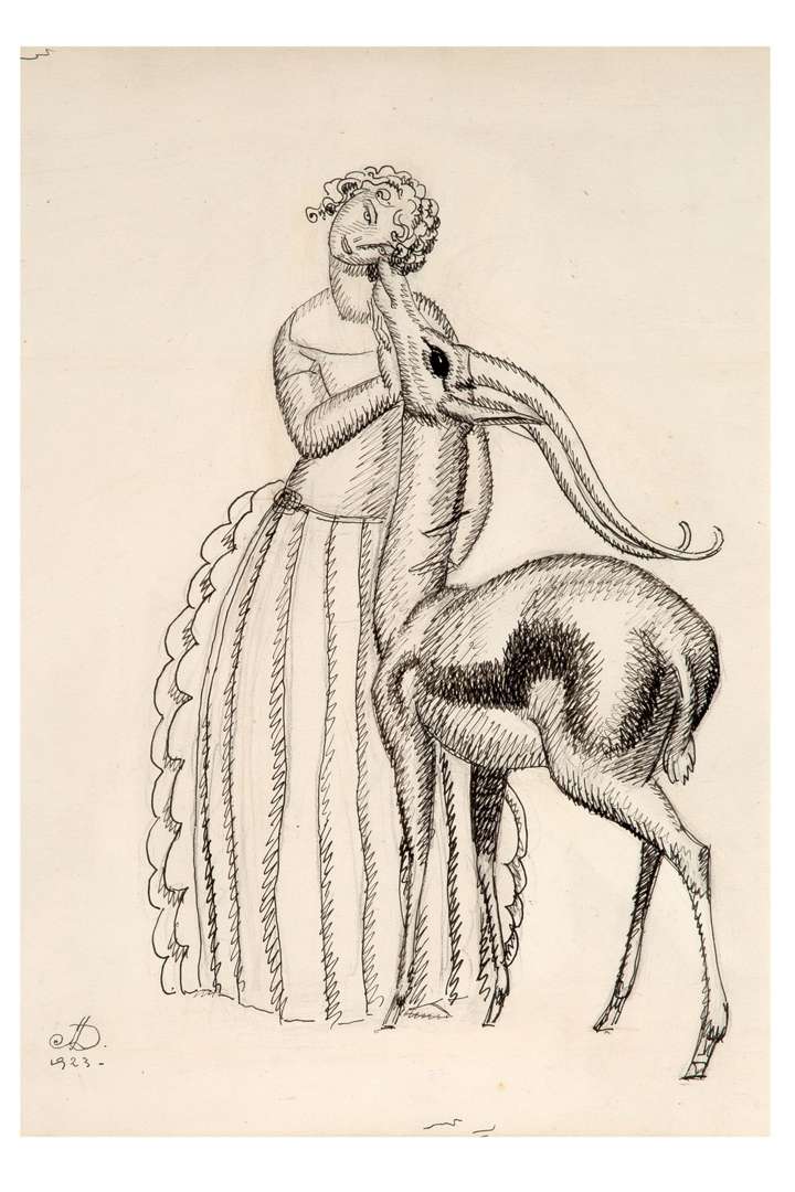 Jean DUPAS, Jeune femme à l'antilope, dessin à l'encre noire, monogramée et datée 1923 en bas à gauche, 24 x 17 cm. (1 pièce)