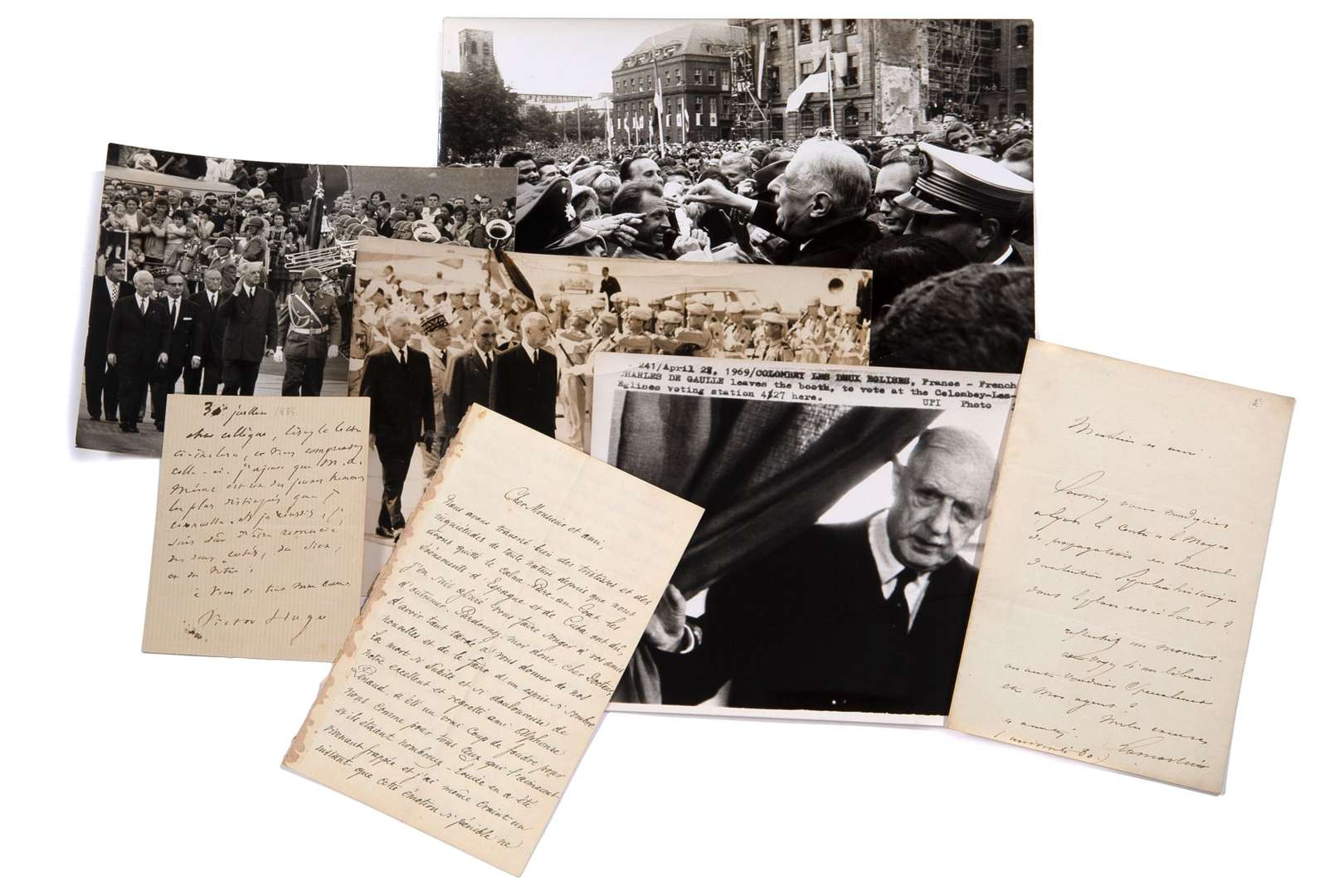 Charles DE GAULLE (41 photographies historiques), Paul DEROULEDE (2 pièces), SIEGE DE PARIS (1 BAM), Victor HUGO (1 pièce), José Maria DE HEREDIA (1 pièce), Jean GALTIER-BOISSIERE (1 pièce) et Alphonse de LAMARTINE (1 pièce).