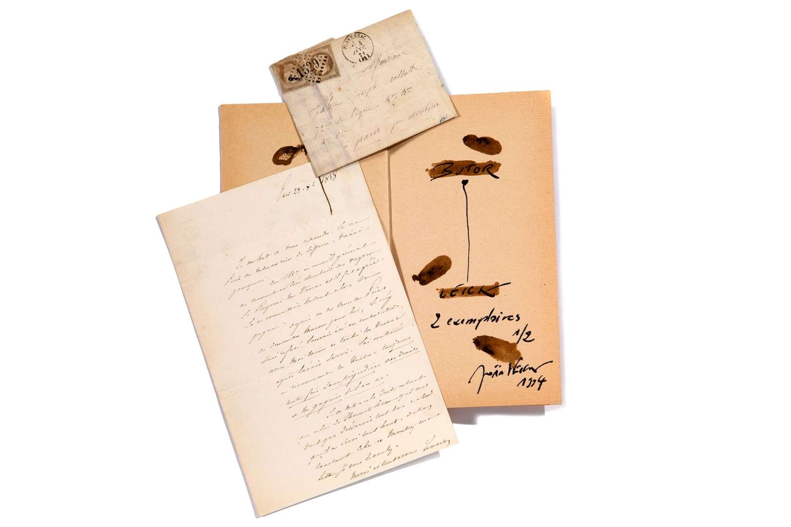 On y joint LEICK (Joel) - BUTOR (Michel) Vertigineuses bergeries. 1994. In folio, couverture en plastique souple avec impression. Un des 2 exemplaires (n°1) signé des auteurs et daté 1994. Illustrations de Joël LEICK. (1 pièce).