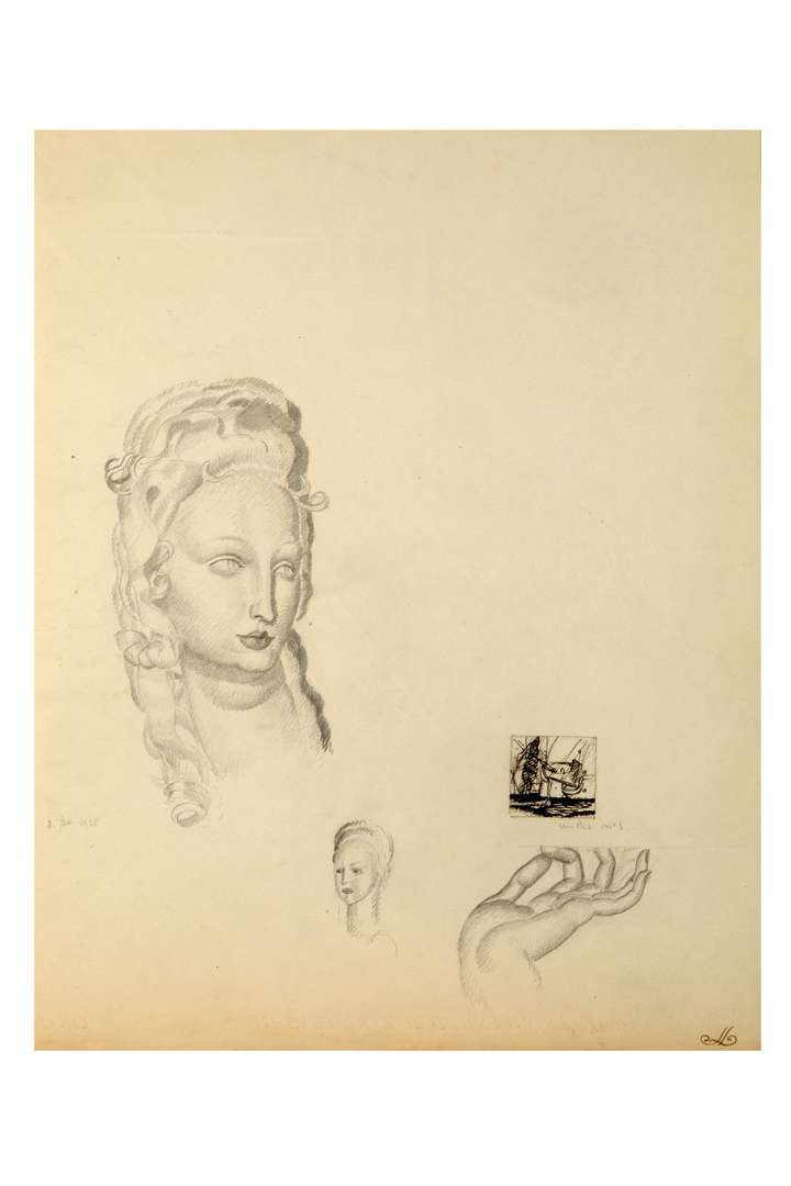 Jean DUPAS, Tête de femme", étude au fusain sur papier beige et rehaussé d'encre de chine, 28x22 cm 1925, encadré, Prosper MERIMEE (1 pièce), Louis FRANCHET D'ESPEREY (1 pièce), Léon DAUDET (1 pièce) et Auguste PREAULT (2 pièces).