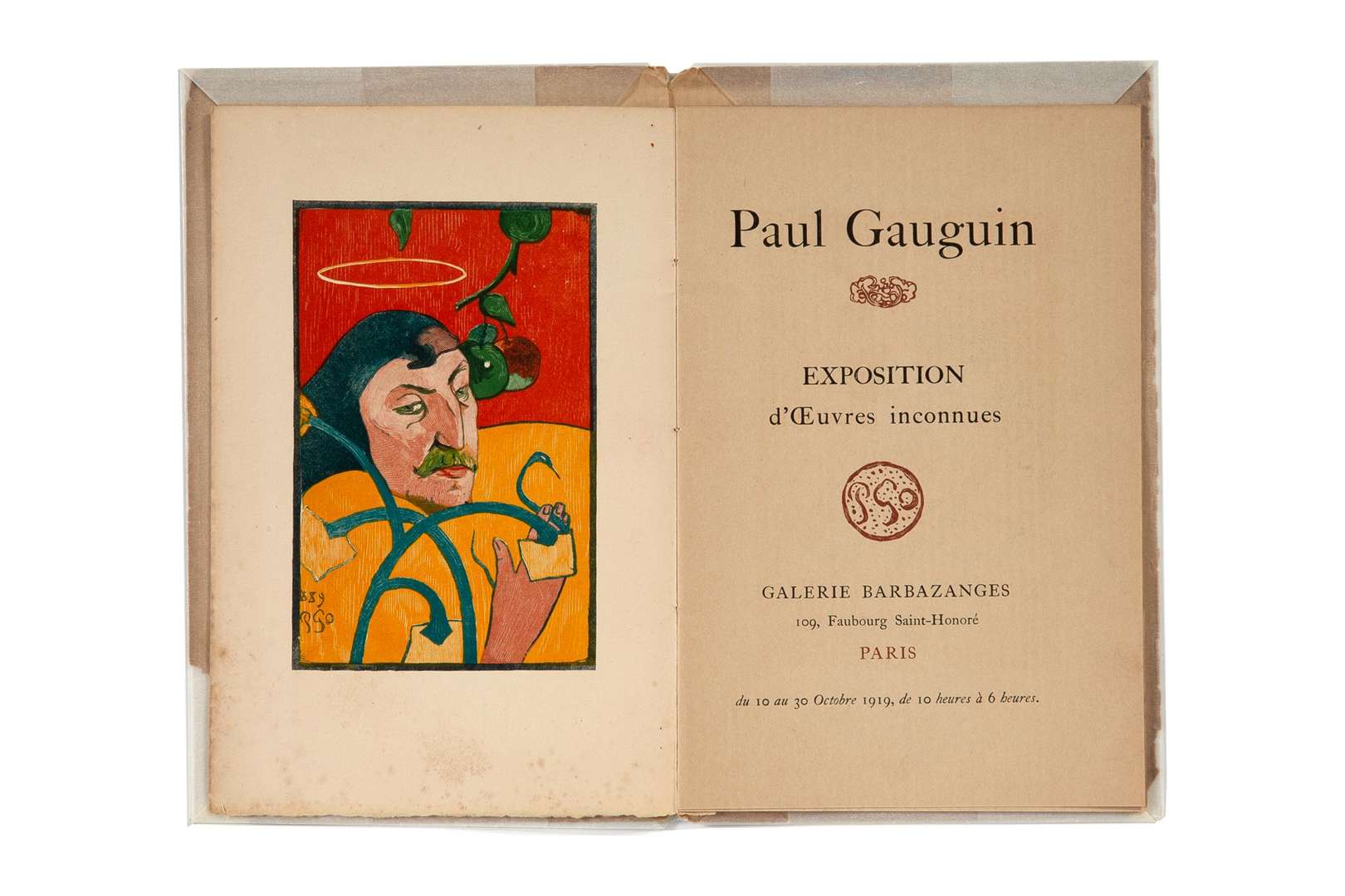Cette exposition présentait 22 tableaux et 7 objets d'arts (plâtre peint, bois sculpté, lithographie) issus de la période de Gauguin au Pouldu, en Bretagne, en 1889 et 1890. L'artiste habitait l'auberge de Marie Henry, entouré d'une génération de peintres tels Emile Bernard, Sérusier et Filiger. "Il y peindra coup sur coup en quelques mois une série de chefs-d'oeuvre de plus en plus libres, colorés, imaginatifs" (Françoise Cachin) tels Le Christ jaune et La Belle Angèle. Gauguin au Pouldu inventait le "synthétisme" ou "primitivisme" qui devait enthousiasmer la critique : Octave Mirbeau allait parler d'un "mélange inquiétant et savoureux de splendeur barbare, de lithurgie catholique, de rêverie hindoue, d'imagerie gothique, de symbolisme obscur et subtil" (février 1891). Cartel : (Paris, 1848 - Atuona (Îles Marquises), 1903) Édition originale Exposition d’oeuvres inconnues, Paris, Galerie Barbazanges, 10 au 30 octobre 1919. Cette exposition présentait 22 tableaux et 7 objets d’arts (plâtre peint, bois sculllllppppté, lithographie) issus de la période de Gauguin au Pouldu, en Bretagne, en 1889 et 1890. L’artiste habitait l’auberge de Marie Henry, entouré d’une génération de peintres tels Émile Bernard, Sérusier et Filiger. À cette période, Gauguin peindra des toiles (Le Christ jaune, La Belle Angèle), de plus en plus colorées et imaginatives. Un travail qui devait enthousiasmer la critique, Octave Mirbeau allait parler dès février 1891, d’un « mélange inquiétant et savoureux de splendeur barbare, de liturgie catholique, de rêverie hindoue, d’imagerie gothique, de symbolisme obscur et subtil ».
