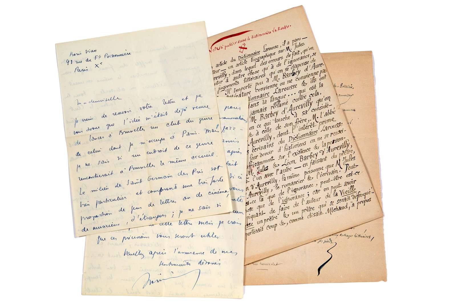 Boris VIAN à Jerry COOKS sur Saint-Germain-des-Prés (1 pièce), Léon BLOY, avec titre et signature de la main de Jules BARBEY D'AUREVILL (1 pièce), Fernand BIDAUX (1 pièce) et Georges MIGOT (1 pièce).
