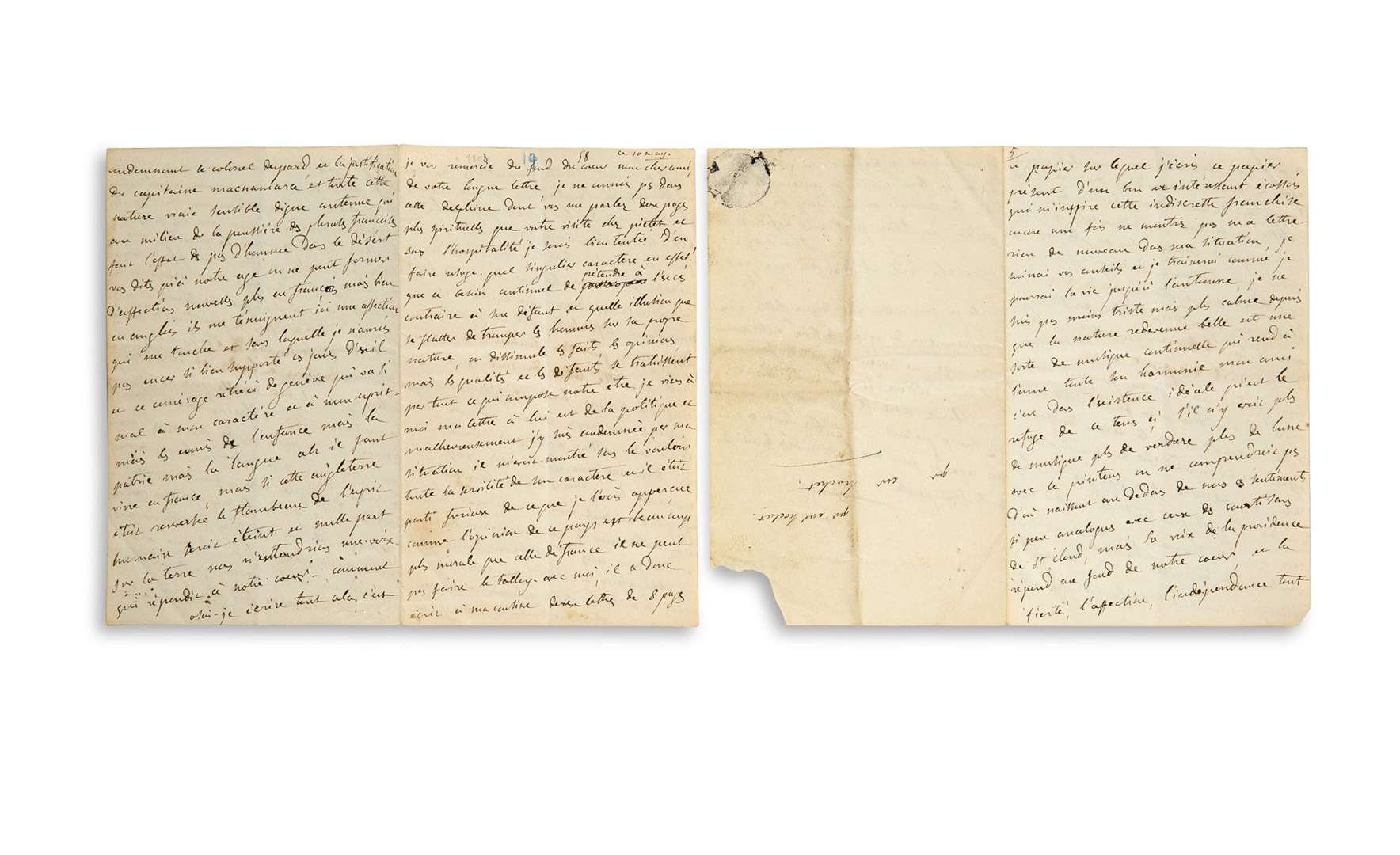 L.A., 10 mars [1803] , s.l., adressée à Claude HOCHET. 7 pages in-8 autographes à l'encre noire sur 2 feuillets doubles (coin inférieur droit du second feuillet déchiré sans manque, trace de cachet, pliures).