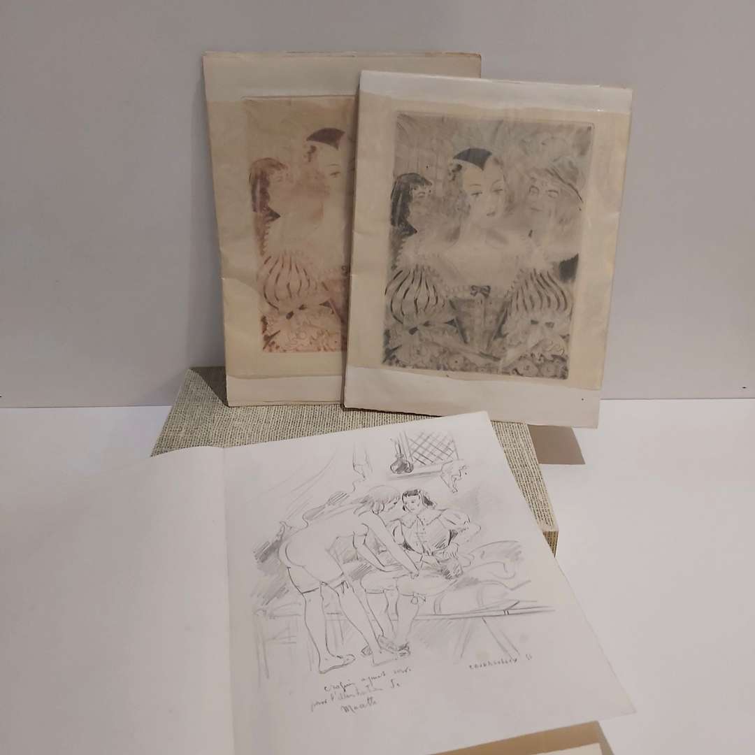 Tirage à 95 exemplaires justifiés et signés par l'artiste, celui-ci un des 35 exemplaires sur Arches (n° 14) contenant un dessin original au crayon, signé et daté par l'artiste, et deux suites supplémentaires des illustrations en noir et sanguine, second papier après 5 exemplaires sur Japon et avant 55 sur vélin.