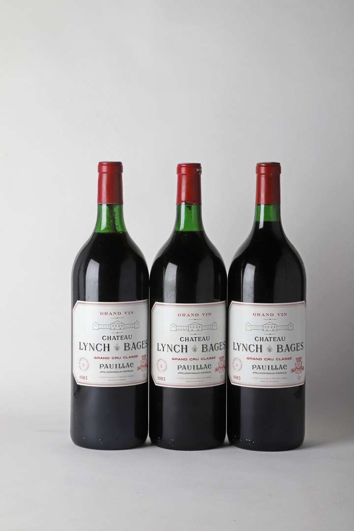 3 Mag CHÂTEAU LYNCH BAGES (Caisse Bois d'origine) (2 T.L.B| 1 c.c. légères| 1 c.l.a. bas de jupe par guillotines et 1 c.a. au sommet) - 1983 - GCC5 Pauillac