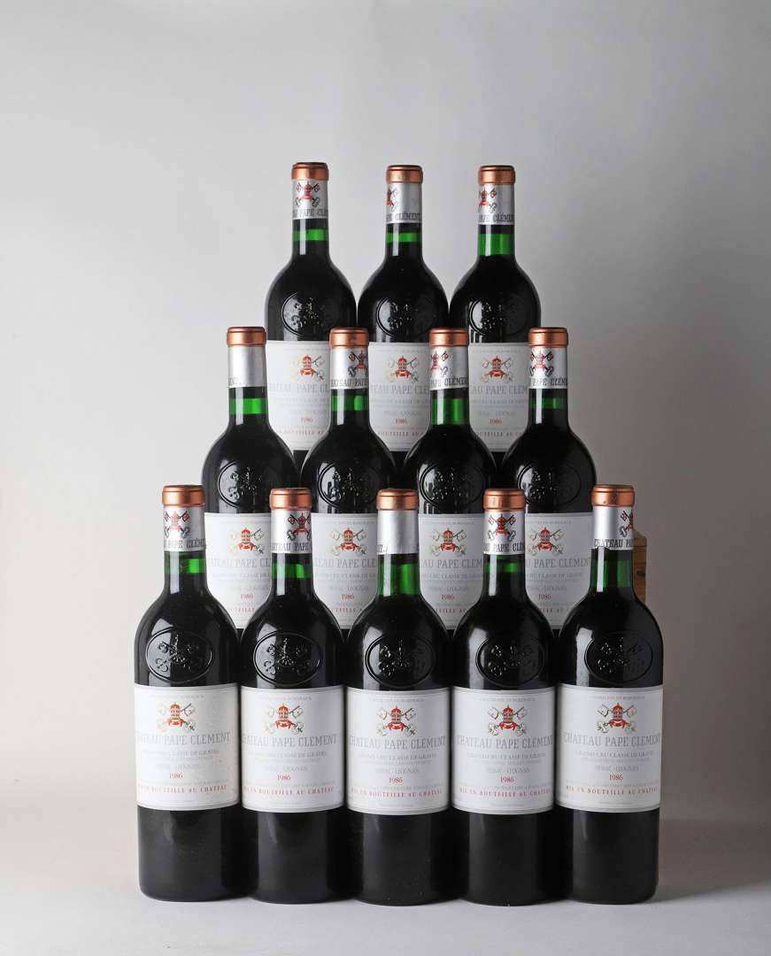 12 B CHÂTEAU PAPE CLÉMENT (Caisse Bois d'origine) (3 B.G| 2 c.a. bas de jupes par guillotines) - 1986 - CC Graves