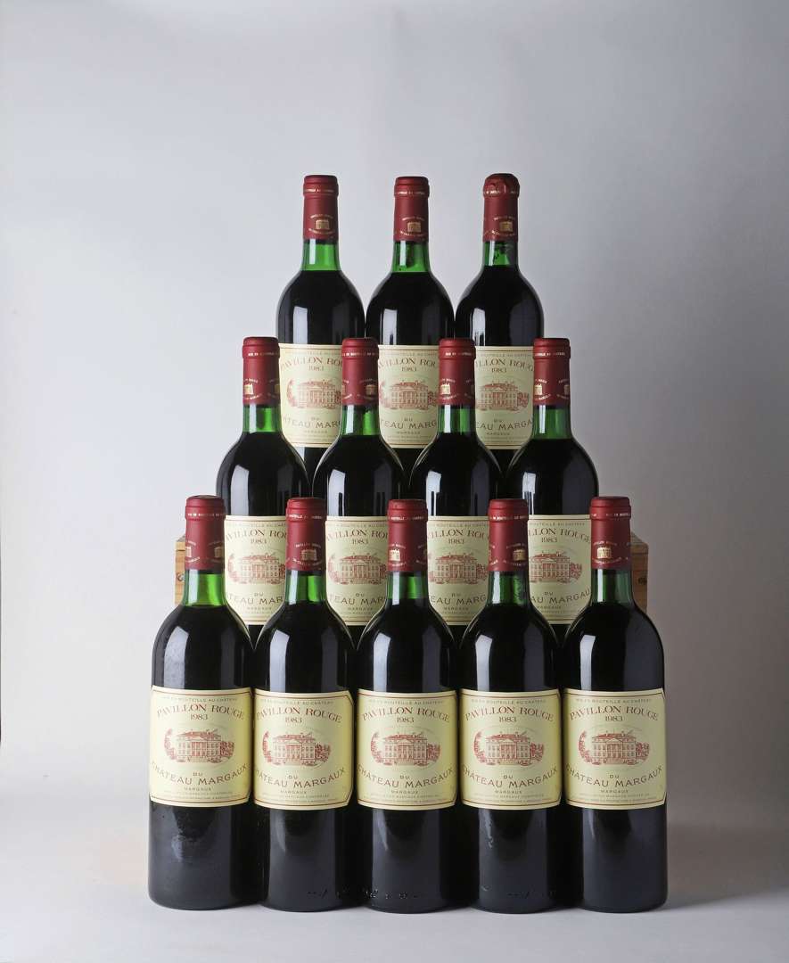 12 B PAVILLON ROUGE DU CHÂTEAU MARGAUX (Caisse Bois d'origine) (4 B.G| 5 T.L.B.+ et 2 T.L.B| 1 accroc bas de jupe par guillotines| 1 capsule gonflée) - 1983 - Margaux