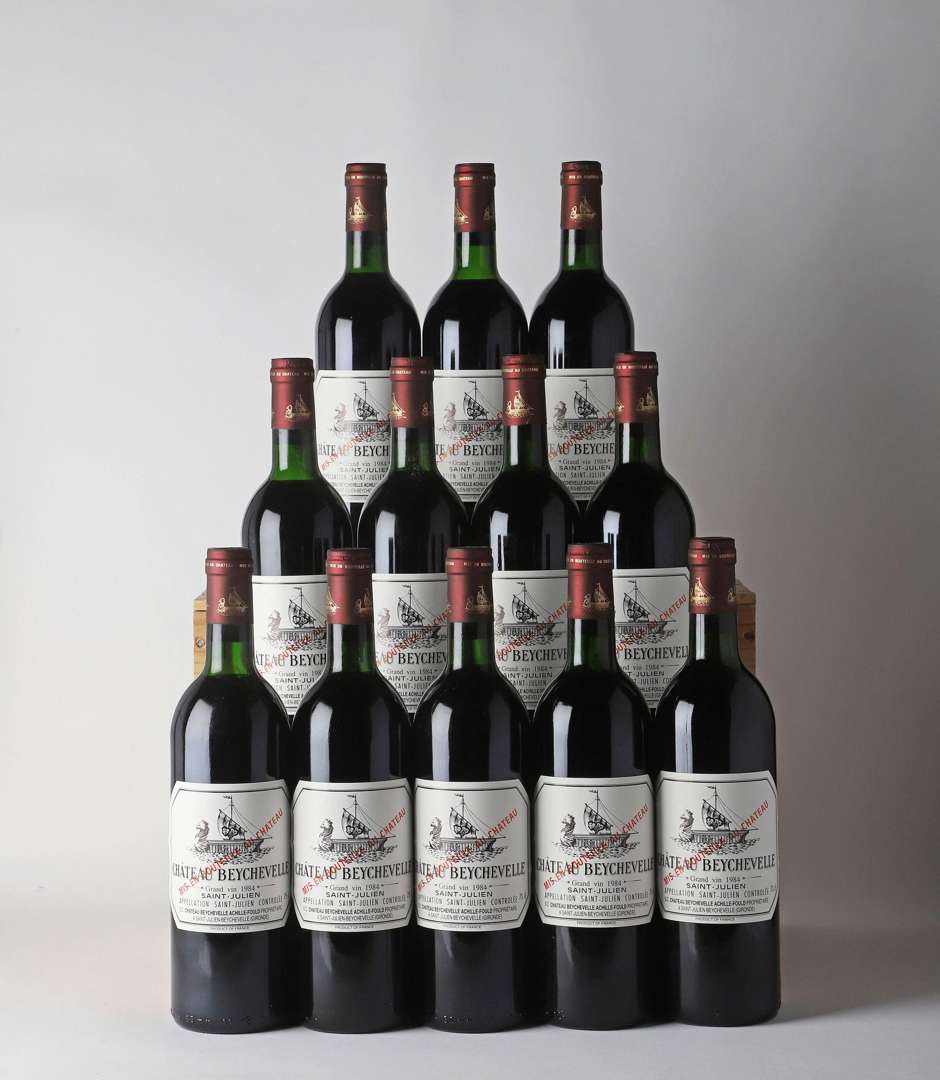 12 B CHÂTEAU BEYCHEVELLE (Caisse Bois d'origine) (5 B.G| 3 T.L.B.+ et 4 T.L.B| 3 capsules avec 1 accroc bas de jupes par guillotines) - 1984 - GCC4 Saint-Julien