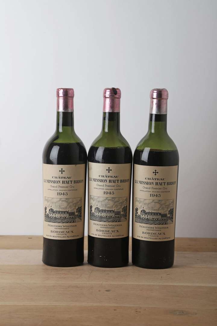 3 B CHÂTEAU LA MISSION HAUT-BRION (1 H.E.| 1 M.E.+| 1 M.E| e.l.s| 1 c.s| 2 c.c. dont 1 abimée au sommet| 1 bouchon fragile très engagé) - 1945 - CC Graves