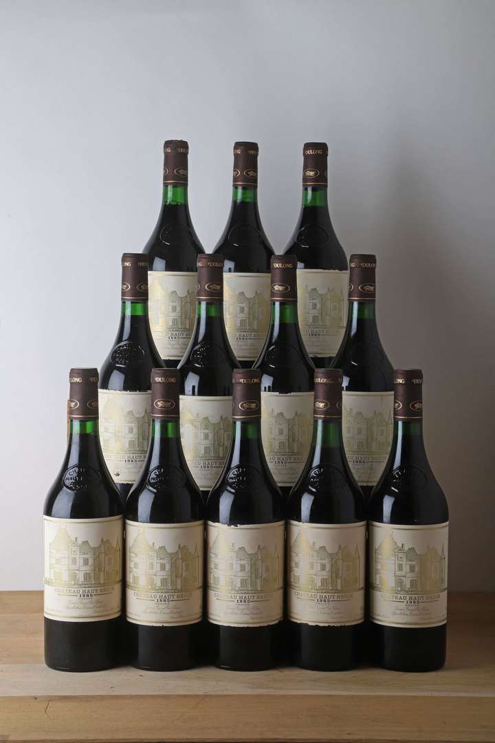 12 B CHÂTEAU HAUT-BRION (Caisse Bois d'origine) (1 à 2,5 cm| 6 e.t.h. dont 2 e.l.a| 2 e.a| 4 e.t.a| 1 c.s| capsules négoce) - 1985 - GCC1 Graves