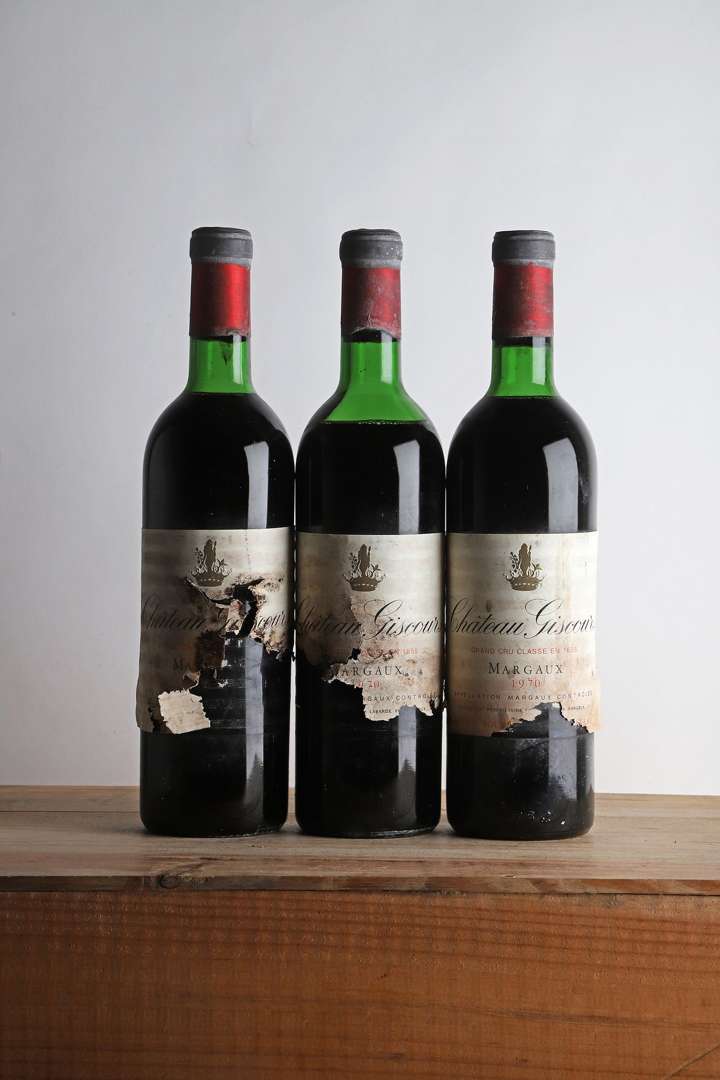 3 B CHÂTEAU GISCOURS (2 T.L.B| 1 M.E.+| e.q.i. avec 1 millésime illisible| c.l.a.) - 1970 - GCC3 Margaux