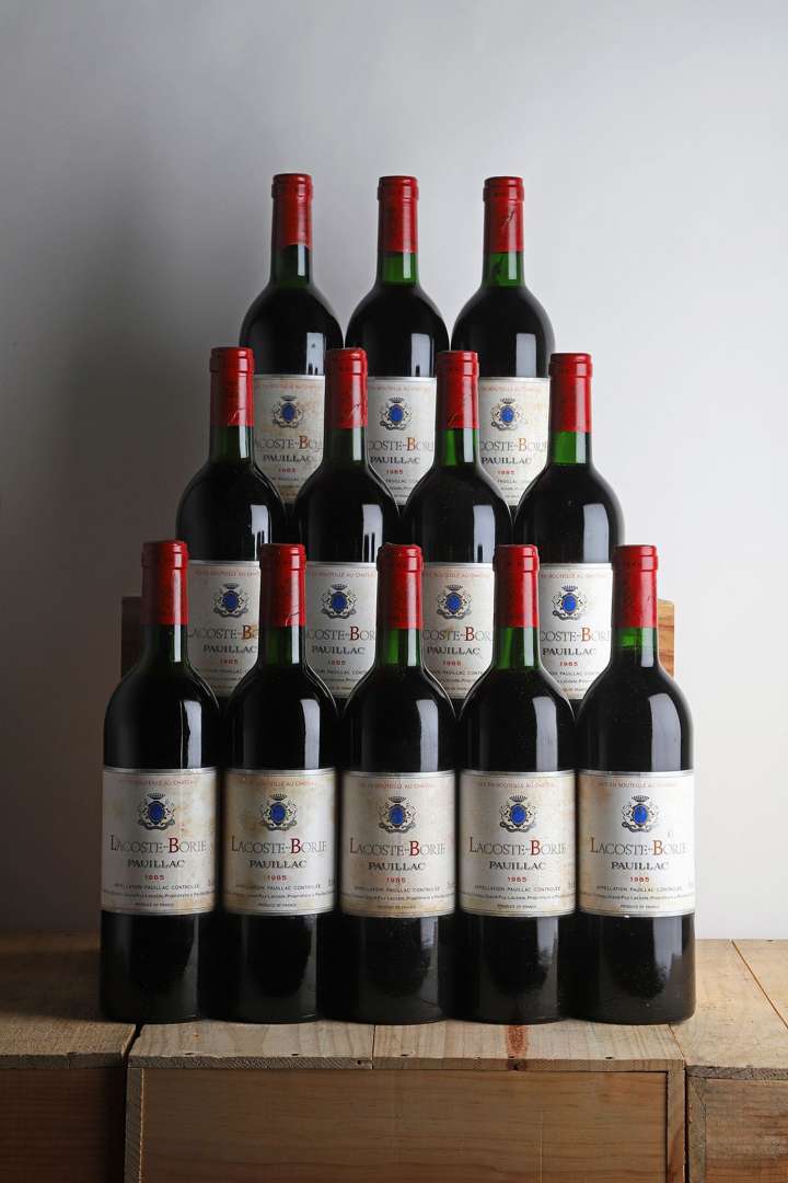 12 B LACOSTE-BORIE (Caisse Bois d'origine) (3 B.G| 6 T.L.B.+| 1 T.L.B. et 1 H.E.+| e.t.h. à e.l.a.) - 1985 - Pauillac