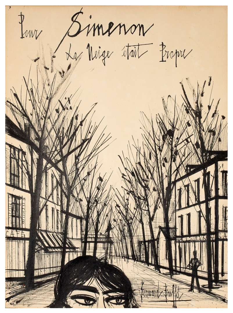 Œuvre atypique jamais présentée sur le marché, cette encre concentre nombre d’éléments importants. Son titre est tiré d’un jeu de mots de Bernard Buffet sur un roman policier de l’écrivain Georges Simenon publié en 1948 et intitulé La Neige était sale. Le thème de la vue de village, très utilisé par Bernard Buffet, se prête particulièrement à l’ambiance que donne Simenon à ses œuvres. Fait très rare, Buffet intègre un personnage dans cette vue, qui contemple la scène de loin. Enfin, ce visage au regard perçant au premier plan fait de cette œuvre sur papier une pièce unique et particulièrement rare.