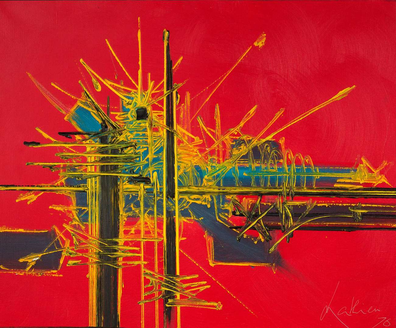 L’œuvre ici présentée est peinte par Georges Mathieu en 1976. Alors que l’artiste élargit déjà sa palette, la vivacité du trait explose sur un fond rouge vif, rendant hommage à l’expressivité de la calligraphie qui lui est chère. Griffée de jaune et traversée de bleu, la toile reprend les codes d’un langage déjà parfaitement maîtrisé par l’artiste. Le contraste du trait noir impose un rythme soutenu à la composition, dont la tension réside en l’accumulation des coups de pinceaux au centre gauche de la toile. La liberté du pinceau de Georges Mathieu semble exploser en une couronne jaune au tracé rigide, qui jaillit du centre de la composition.