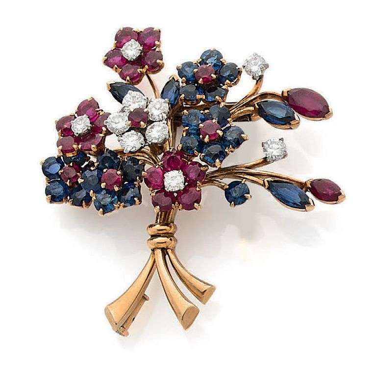 A sapphire, diamond and ruby, gold and platinum brooch, signed Van Cleef & Arpels