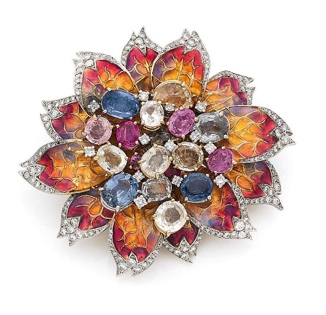 Cette broche fleur signée Tiffany & Co sertie de nombreux saphirs multicolores sur une monture en or émaillée concentre le savoir-faire joaillier de la maison. Elle allie un choix méticuleux des gemmes, mis en valeur par un entourage de pétales à l’émail flamboyant.