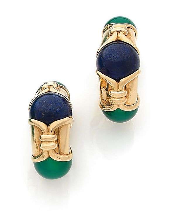 A chrysoprase, lapis lazuli and gold earrings, signed Bulgari