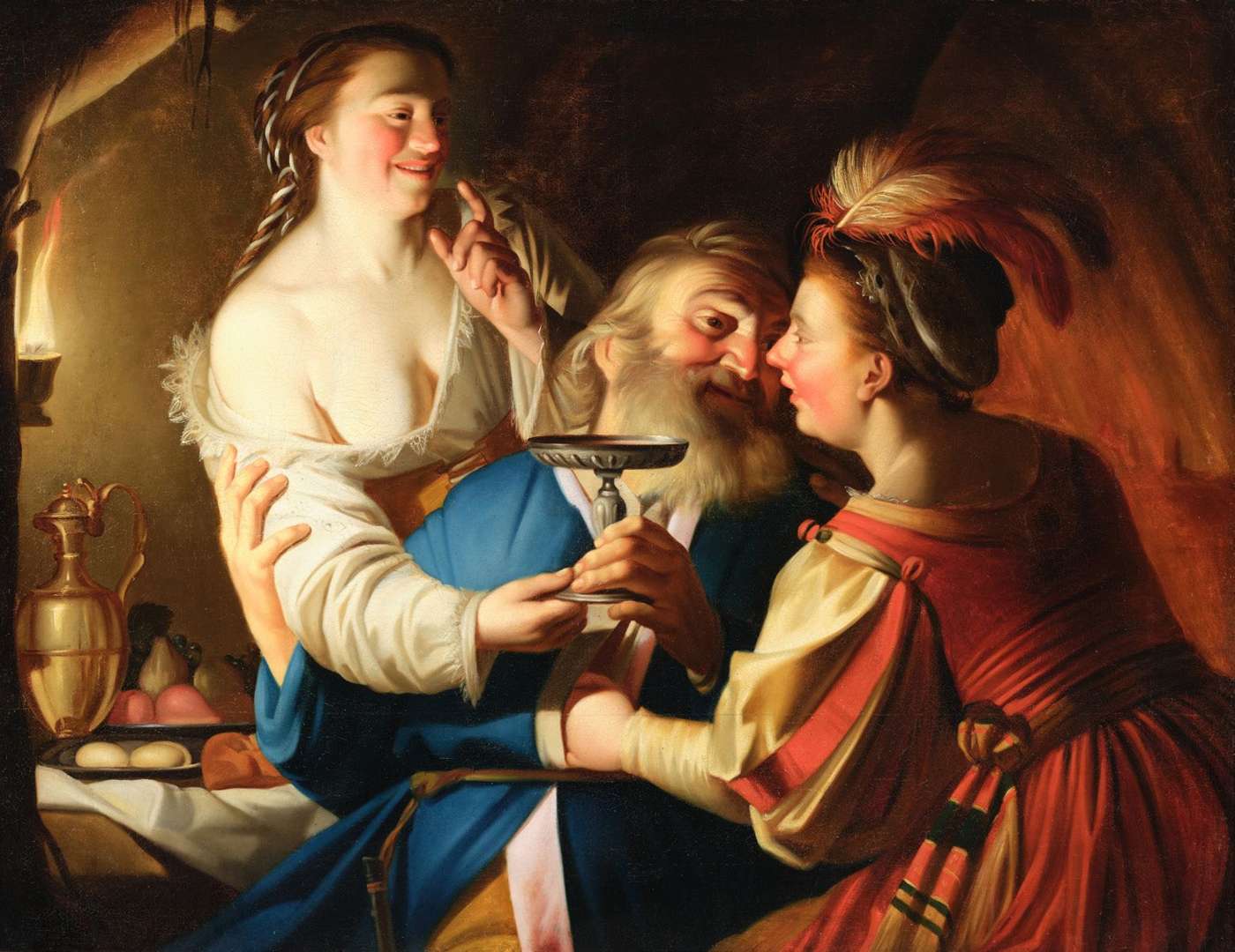 Datant d'une période proche de ses années en Italie, Honthorst fait de sa composition l'incarnation de cet esprit de décadence qu'il a côtoyé à Rome. Loth et ses filles, épisode vétérotestamentaire, fait référence à la destruction de Sodome et Gomorrhe : «Et l'Eternel dit : Le cri contre Sodome et Gomorrhe s'est accru et leur pêché est énorme.». Condamnées pour leurs péchés, les villes sont détruites par le «souffre et le feu». Les deux anges envoyés de Dieu, accueillis par Loth juste avant qu'ils n'agissent, le laissent s'enfuir avec sa femme et ses deux filles. Sa femme, ayant jeté un regard en arrière, est immédiatement changée en statue de sel. Les trois autres rescapés, après être passés par la ville de Zoar, se réfugient à l'écart dans la montagne. Ses deux filles, craignant de ne trouver d'hommes convenables (partageant des origines communes), enivrent leur père afin de s'assurer chacune une descendance. L'une donna naissance à Moab, premier des Moabites, la seconde à Ben-Ammi, le premier des Ammonites, peuples voisins d'Israël. Loth et ses filles se fait catharsis de ces basfonds. Mêlant luxure, inceste, ivresse, tromperie, l'épisode choisi par Honthorst met en scène l'homme dans ce qu'il a de plus vil. La trivialité du thème et de la scène, la promiscuité des personnages, la monumentalité, la composition en frise, le coloris chaud, la facture lisse et la présence d'une source lumineuse artificielle sont autant de références aux codes formels de Caravage que le peintre se réapproprie. En 1620, Gerrit van Honthorst, surnommé désormais Gherardo delle Notti («Gérard des nuits»), rentre et fonde l'École d'Utrecht, initiant ses émules au caravagisme.