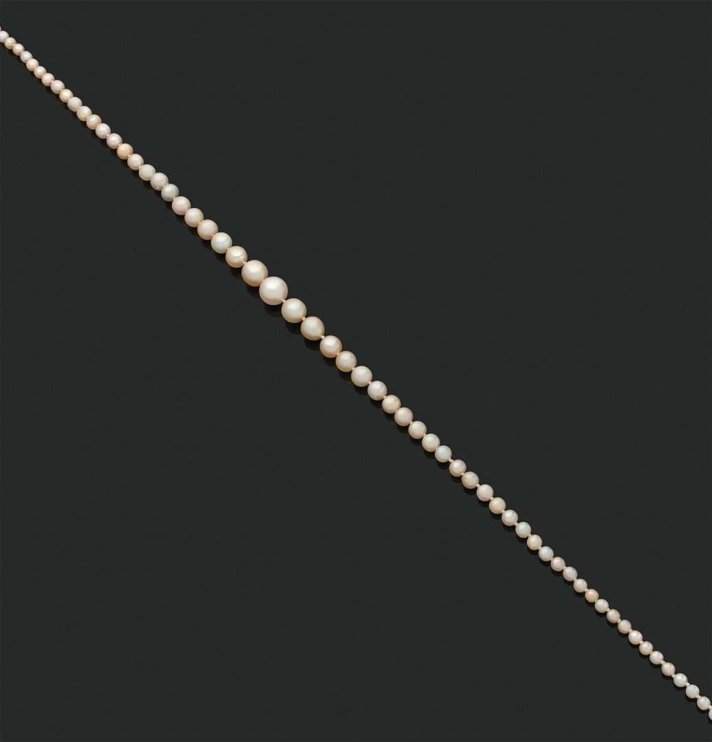 Collier composé d'une chute de 78 perles supposées fines, non testées et 1 perle de culture au centre.
