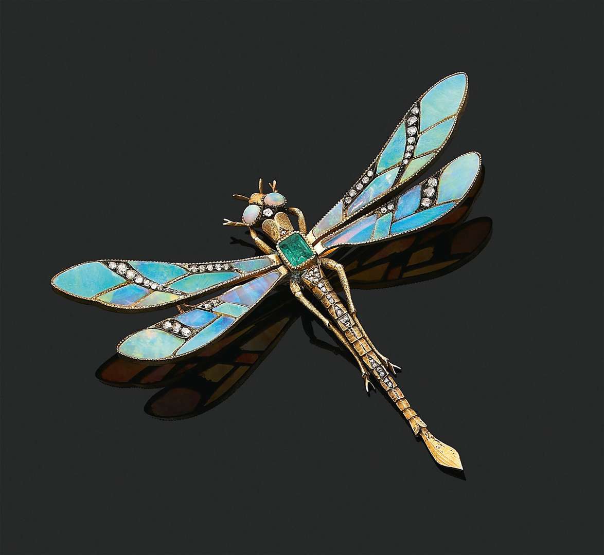 à la vente est un bel exemple de bijou Art Nouveau. Ses ailes sont pavées d’opales et de petits diamants et ses yeux sont sertis de deux opales roses, notons aussi le travail