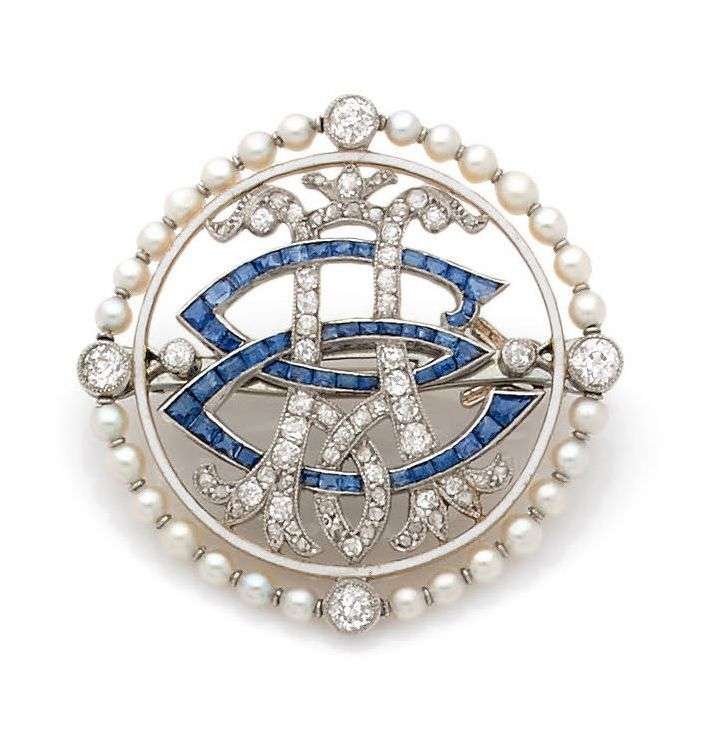 Diamants taille ancienne, saphirs calibrés, perles fines, émail