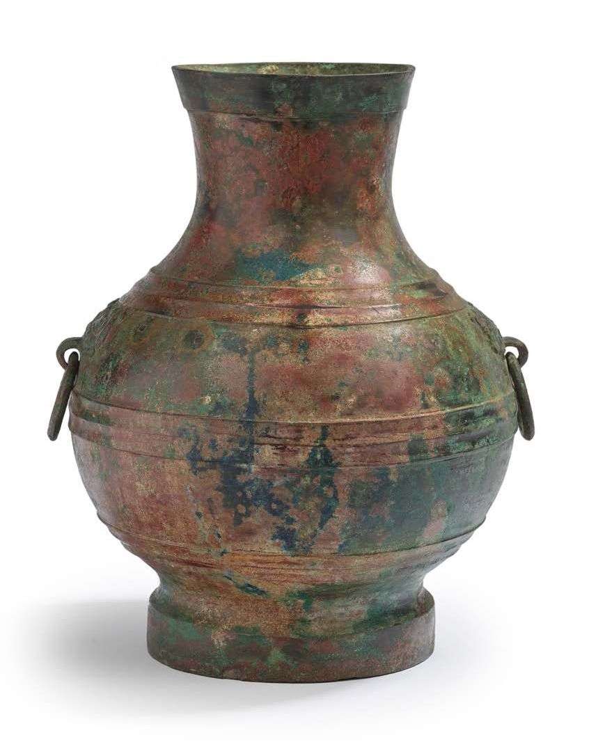 Vase hu en bronze à belle patine verte infusée de rouge, la panse bombée scandée de ressauts, la base et le col soulignés d'un bandeau, les prises en forme de têtes de monstres tenant des anneaux mobiles dans la gueule. H. 32 cm PROVENANCE Elegant House-Chinese Curios, Hong Kong (1995)