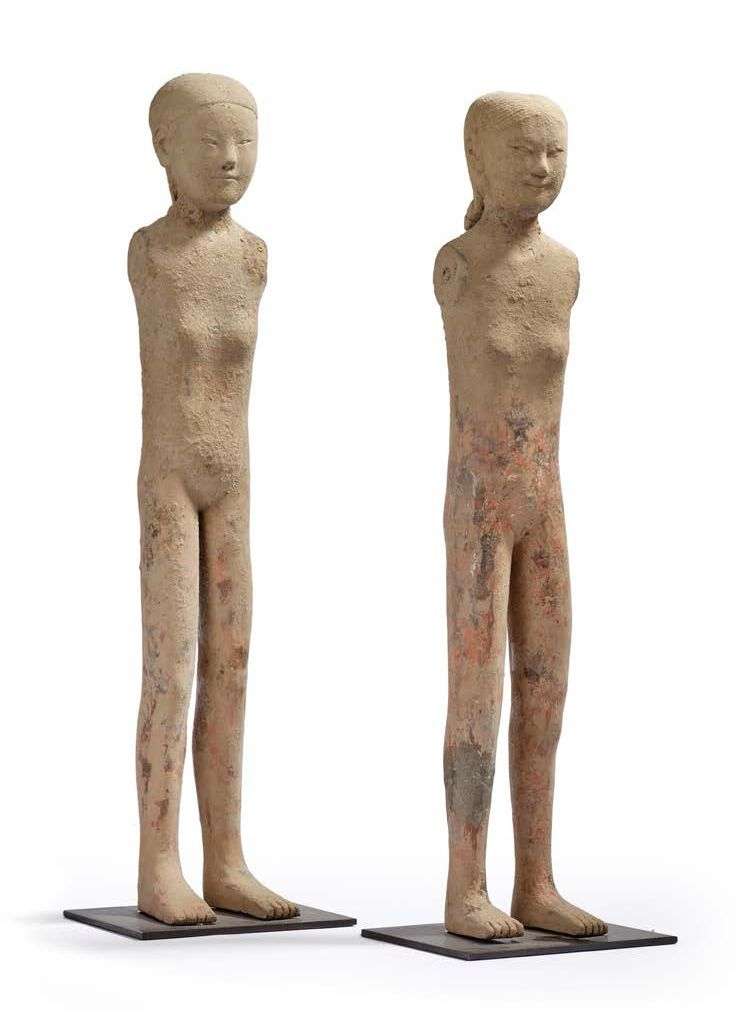 Réunion de deux statuettes de personnages debout, dites « stickmen », en terre cuite grise et engobes, représentés debout, sans vêtement, les cheveux attachés, le visage souriant ou impassible. Socle. H. 54 et 51,5 cm (Restaurations d'usage, quelques éclats et des usures) PROVENANCE Dragon Culture, Hong Kong