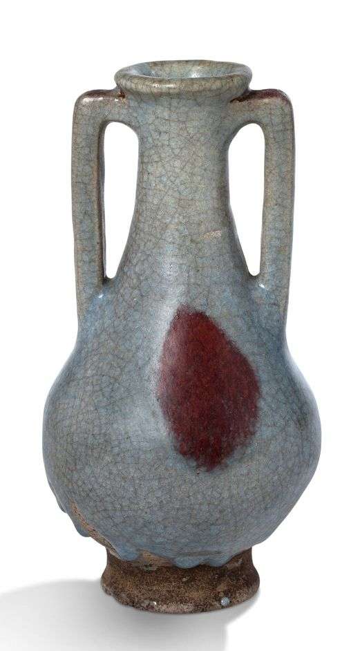 Vase piriforme à anses en grès et couverte jun, chacune des faces agrémentée d'une large tache au rouge de cuivre. H. 17,5 cm (Éclats à la base)