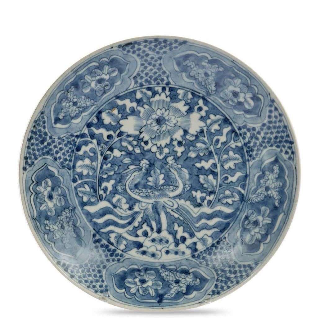 Plat Swatow en porcelaine bleu-blanc, à décor d'un couple de phénix sur des rochers dans les fleurs, l'aile ornée de réserves fleuries polylobées sur fond d'écailles. Diam. 27,2 cm (Défaut d'émaillage)