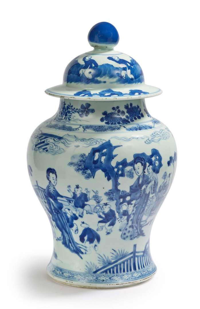 Jarre balustre couverte en porcelaine bleu-blanc, à décor de personnages féminins accompagnés d'enfants sur une terrasse plantée de bananiers et parsemée de roches percées près de pavillons, la base surmontée d'un damier, le col souligné de frises florales et le couvercle orné de jeux d'enfants. Marque symbolique sur la base. H. 37 cm (Un éclat à la base, un éclat au couvercle et des déplacages d'émail)