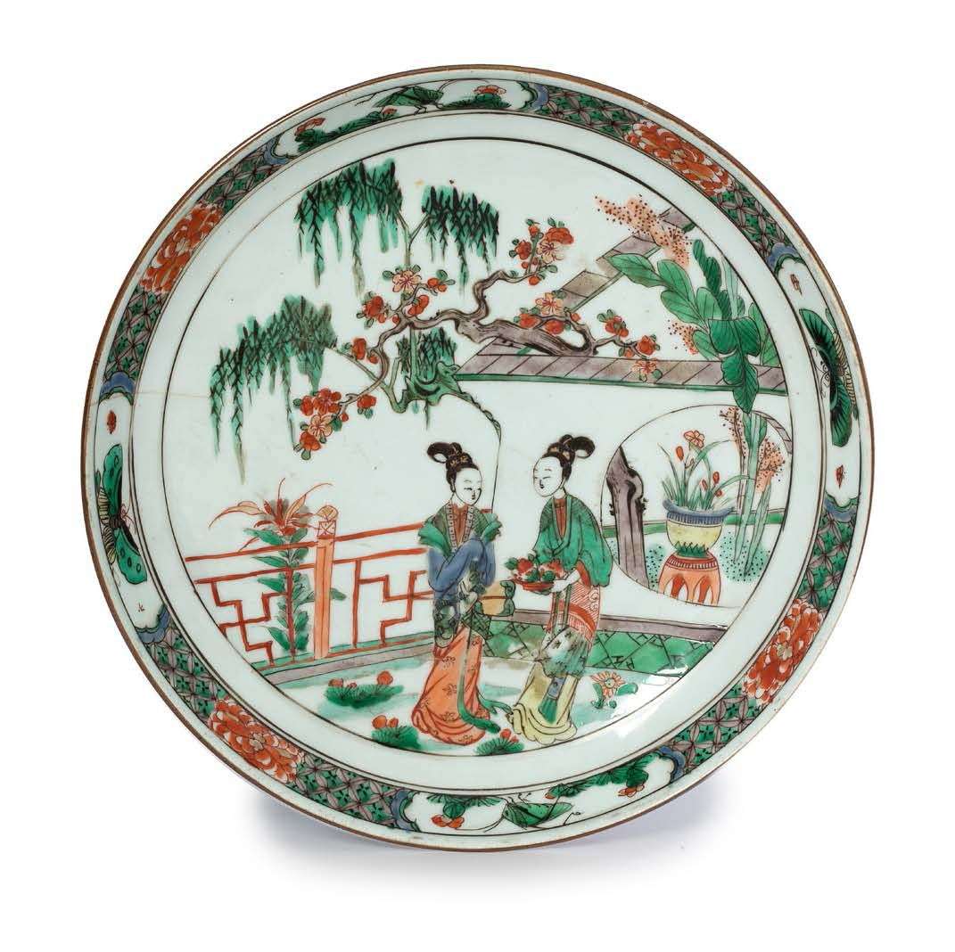 Plat rond en porcelaine et émaux polychromes de la famille verte, à décor de personnages dont l'un tient une coupe emplie de fruits sur une terrasse arborée près d'un pavillon, les bords soulignés à l'intérieur et à l'extérieur de frises animées d'insectes sur fond de damiers fleuris de pivoines. Double-cercle sur la base. Diam. 25,3 cm (Fêlure, infimes égrenures et usures)