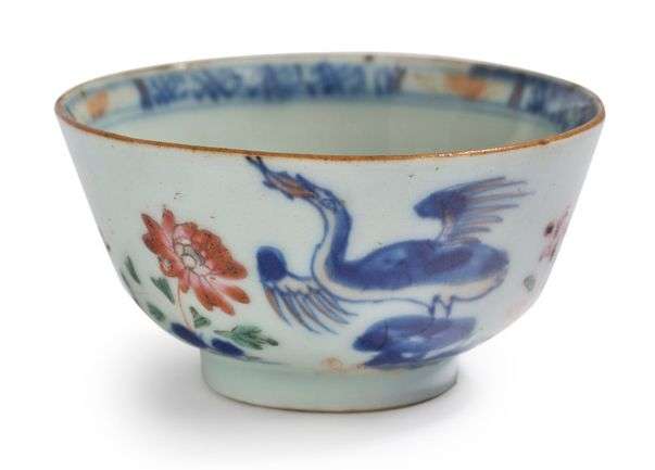 DYNASTIE QING, PÉRIODE YONGZHENG (1723 - 1735) Petite coupe en porcelaine, bleu de cobalt sous couverte et émaux polychromes de la famille rose, à décor d'un héron sur un tertre, les ailes déployées, parmi les fleurs. H. 4 cm - Diam. 7 cm