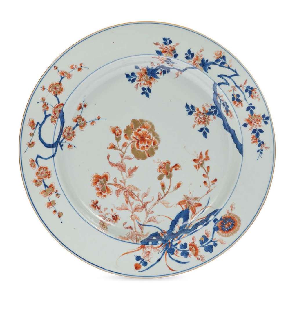 DYNASTIE QING, PÉRIODE KANGXI (1661 - 1722) Plat rond en porcelaine, bleu de cobalt sous couverte et rehauts de dorure, à décor Imari de fleurs et d'arbres en fleurs. Diam. 39,2 cm
