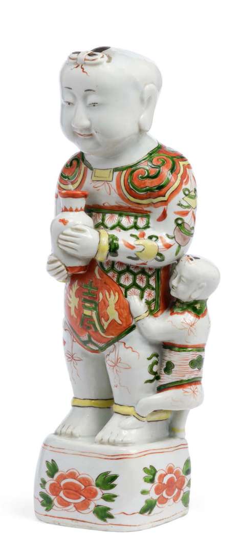 Statuette d'enfant ho ho en porcelaine et émaux polychromes wucai de style Transition, représenté debout sur une base, un vase dans les mains, un jeune enfant s'agrippant à sa jambe gauche, la base laissée en biscuit. H. 33 cm (La base percée, infimes égrenures et des usures)