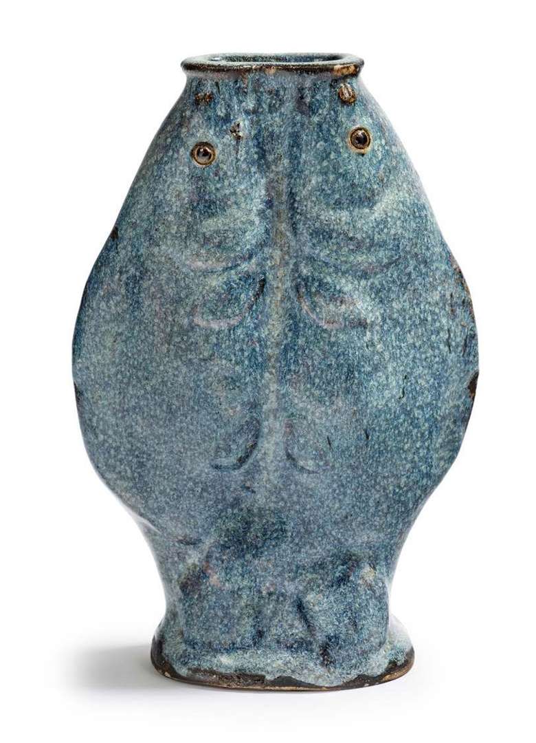 Vase en grès de Shiwan et couverte truitée lavande sur fond brun, en forme de deux carpes affrontées s'élevant des flots, la base laissée en biscuit. H. 27 cm