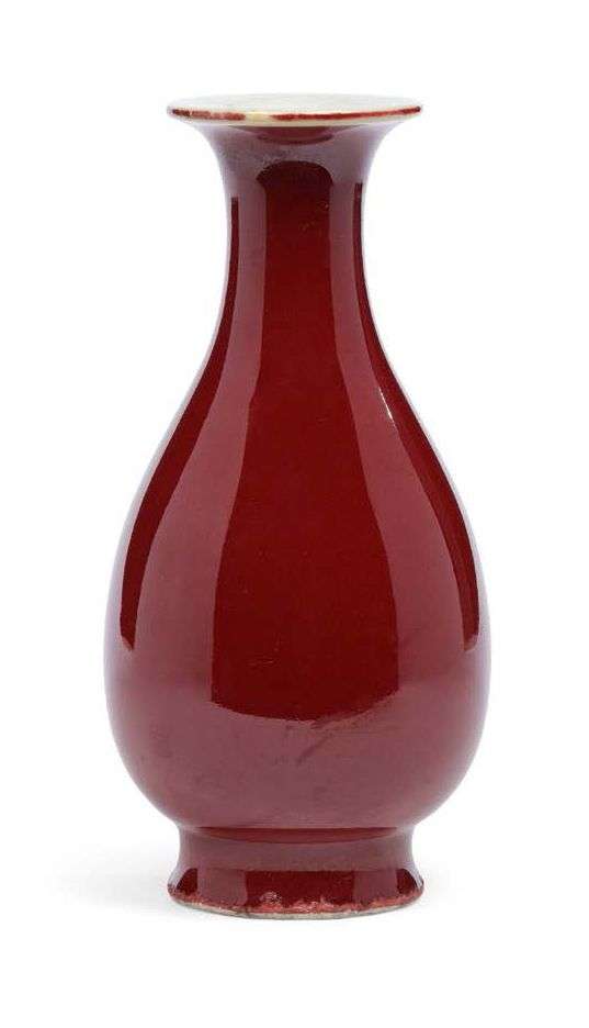 Vase bouteille yuhuchun en porcelaine et couverte sang de boeuf, l'intérieur et la base émaillés blanc. H. 24 cm (Attachés de four à la base et fêlures à l'émail à l'intérieur du col)