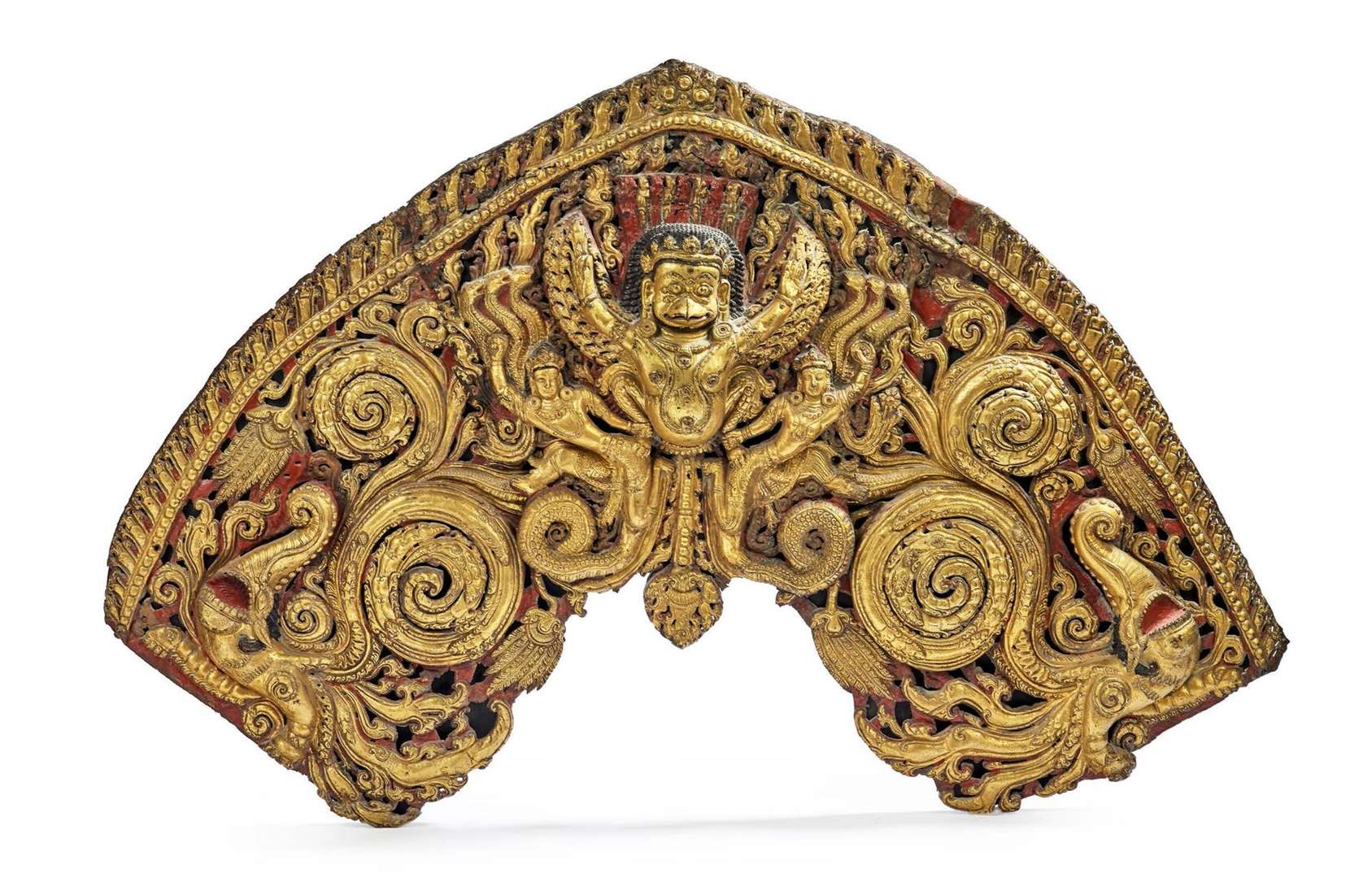 Partie supérieure d'un trône de divinité (torana) en alliage de cuivre repoussé, doré et rehaussé de polychromie, à décor de Garuda, monture de Vishnu, représenté les ailes écartées, flanqué du serpent Gulka et de sa compagne Adisesa et tenant entre les serres les queues de deux makaras agonisants aux extrémités, le bord supérieur souligné de flammèches stylisées et d'un rang de perles. H. 61 cm - L. 94 cm (Restaurations anciennes, manques, cassures et usures) PROVENANCE - Vente, Chinese, Japanese, Indian, Himalayan and Southeast Asian art, Christie's, Amsterdam, 18 octobre 1995, lot 302 - Collection particulière, France (acquis au cours de la vente précédente puis par descendance) OEUVRE EN RAPPORT Notre oeuvre est à rapprocher de trois fragments de toranas conservés au Victoria & Albert Museum de Londres (Inv. IM.142 à B-1926).