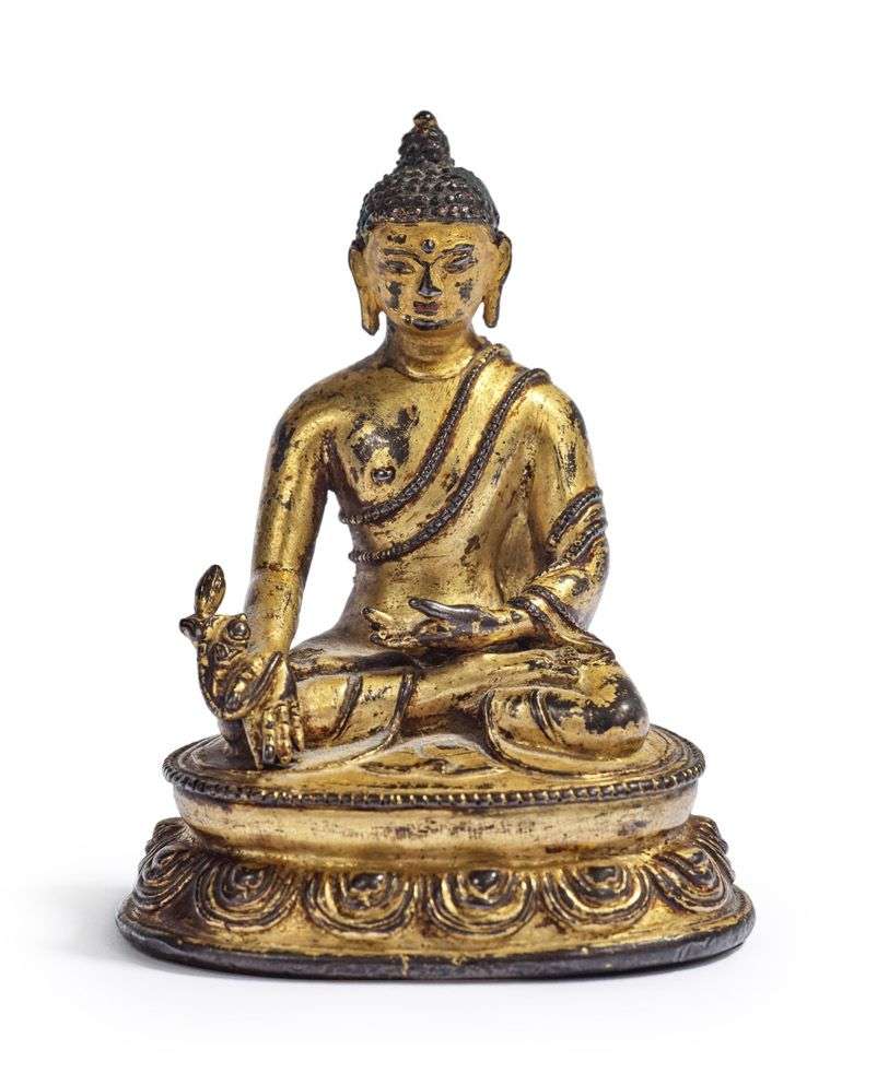 Statuette de Bouddha Shakyamuni en alliage de cuivre doré, représenté assis en vajrasana sur un socle lotiforme, vêtu d'un fin dhoti lui laissant l'épaule droite découverte, la main droite en bhumisparshamudra tenant une tige de lotus, la gauche posée à plat sur son giron, les yeux mi-clos en méditation, les cheveux et l'ushnisha bouclés. Scellée. H. 7,5 cm (Usures)