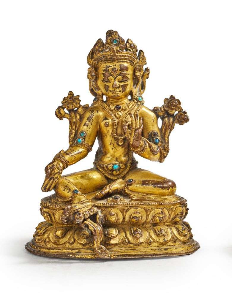 Statuette de Tara verte en alliage de cuivre doré agrémenté de cabochons de turquoise et de verre coloré, représentée assise en ardhaparyanka sur un socle lotiforme, la main droite effectuant le geste du don, la gauche tenant l'extrémité d'une tige de lotus fleurissant au-dessus de son épaule, les yeux mi-clos en méditation, l'urna centré sur le front, ce dernier ceint d'une tiare, le corps paré de bijoux. Socle en pierre verte. H. 10,4 cm (Usures et cabochons postérieurs) PROVENANCE Galerie Gisèle Croës, Bruxelles (1974)