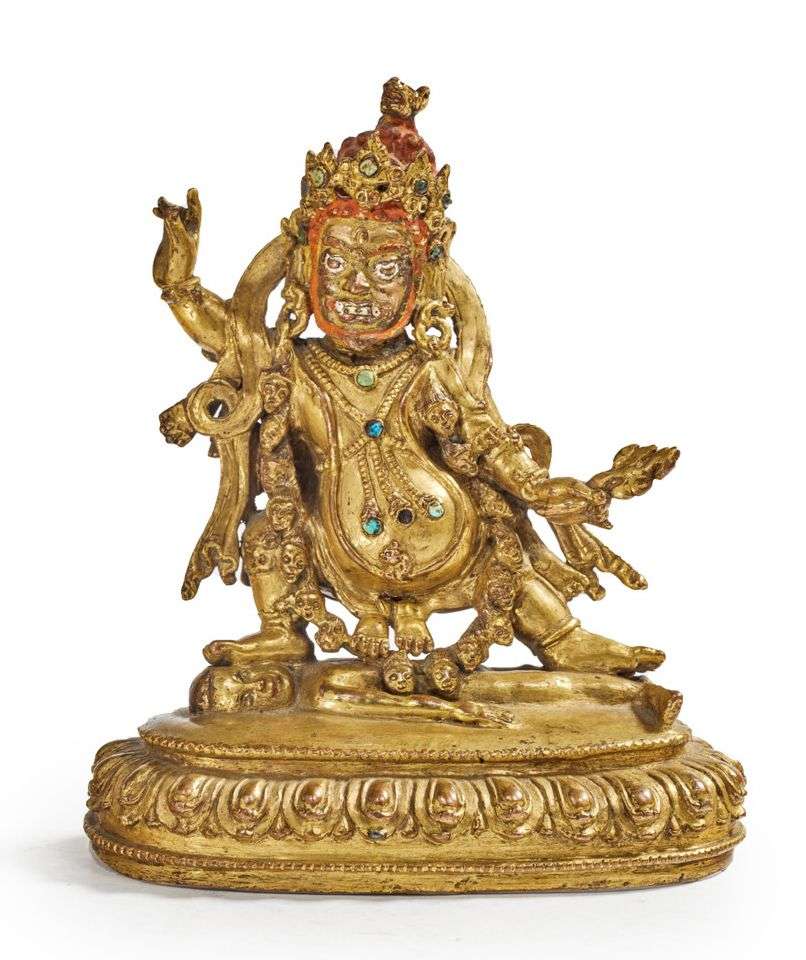 Statuette de Mahakala en alliage de cuivre doré agrémenté de cabochons de turquoise, représenté debout en pratyalidha sur un socle lotiforme occupé par un ennemi terrassé, le bras droit levé, la main gauche tenant un rameau, un long collier de têtes autour du cou, le visage à l'expression farouche, un troisième oeil sur le front, ce dernier ceint d'une tiare, le corps paré de bijoux agrémenté de pendeloques. Socle en pierre verte. H. 11 cm (Attribut dans la main droite et cabochons manquants, usures) PROVENANCE Galerie Gisèle Croës, Bruxelles (1974)