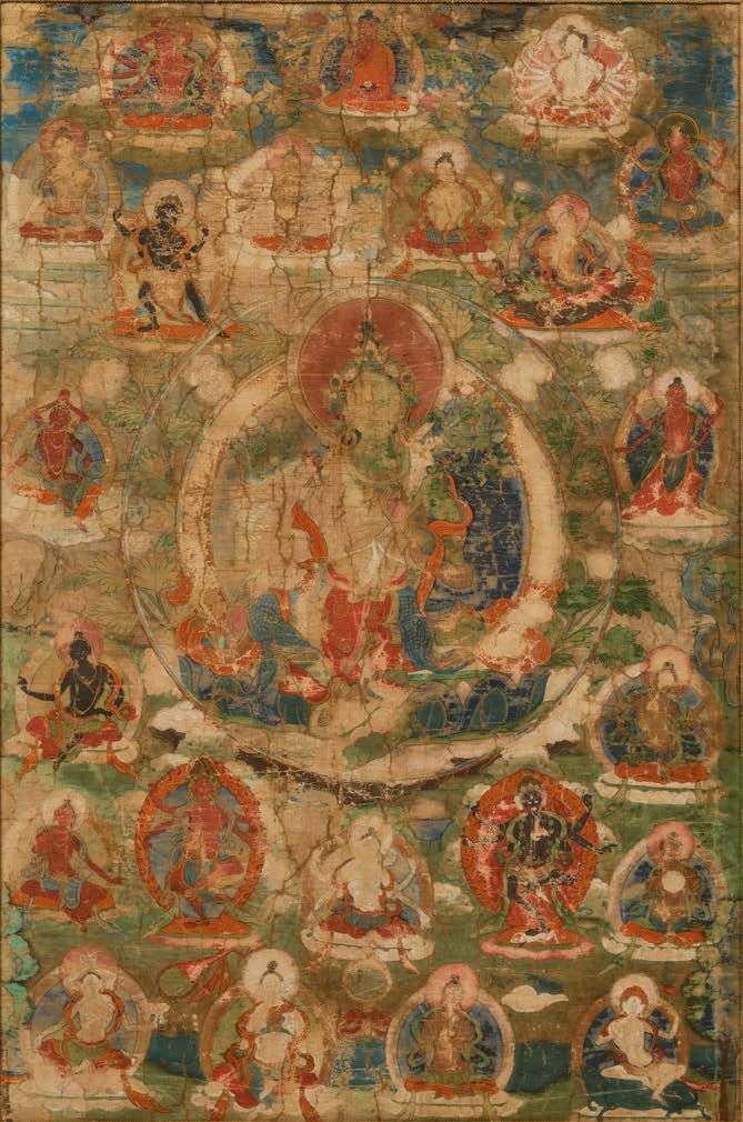 Thangka vertical à l'encre, polychromie et rehauts de dorure sur toile fine, représentant la Tara verte assise en lalitasana sur un socle lotiforme, une tige dans la main, entourée de nombreux bodhisattvas assis en méditation et de divinités secondaires dans un paysage arboré. Encadré sous verre. Dim. 63 x 42 cm (Usures prononcées et plis)