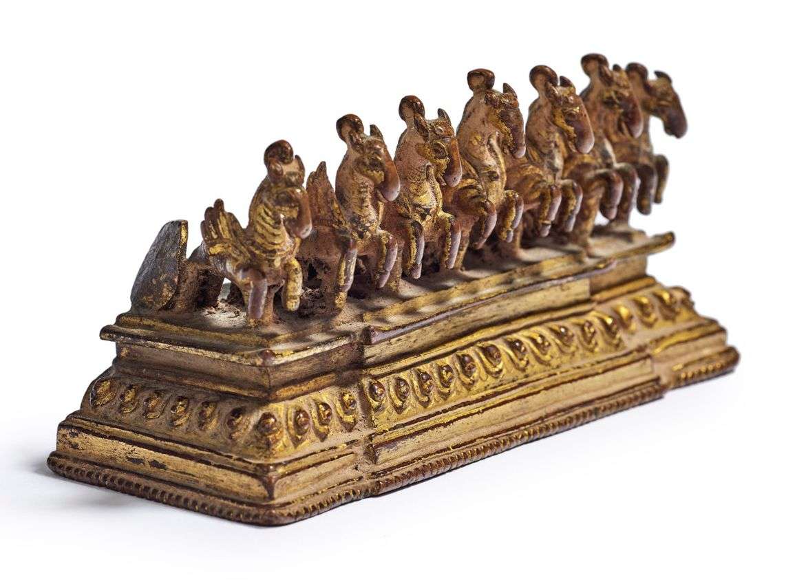 Socle en alliage de cuivre doré, à décor de sept chevaux ailés empanachés représentés en vol au-dessus d'une base moulurée et décorée de lotus. H. 6 cm - L. 11,5 cm (Usures) PROVENANCE - Galerie Le Toit du monde, Paris (1995) - Collection particulière, France (acquis auprès de cette dernière) NOTE Cette oeuvre est probablement le socle d'une statuette de Surya, dieu hindou du Soleil, dont le char est habituellement tiré par sept chevaux.